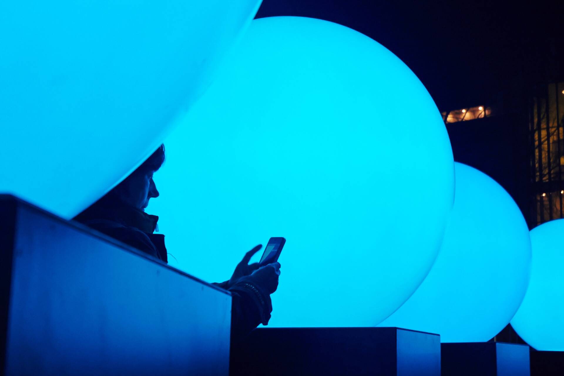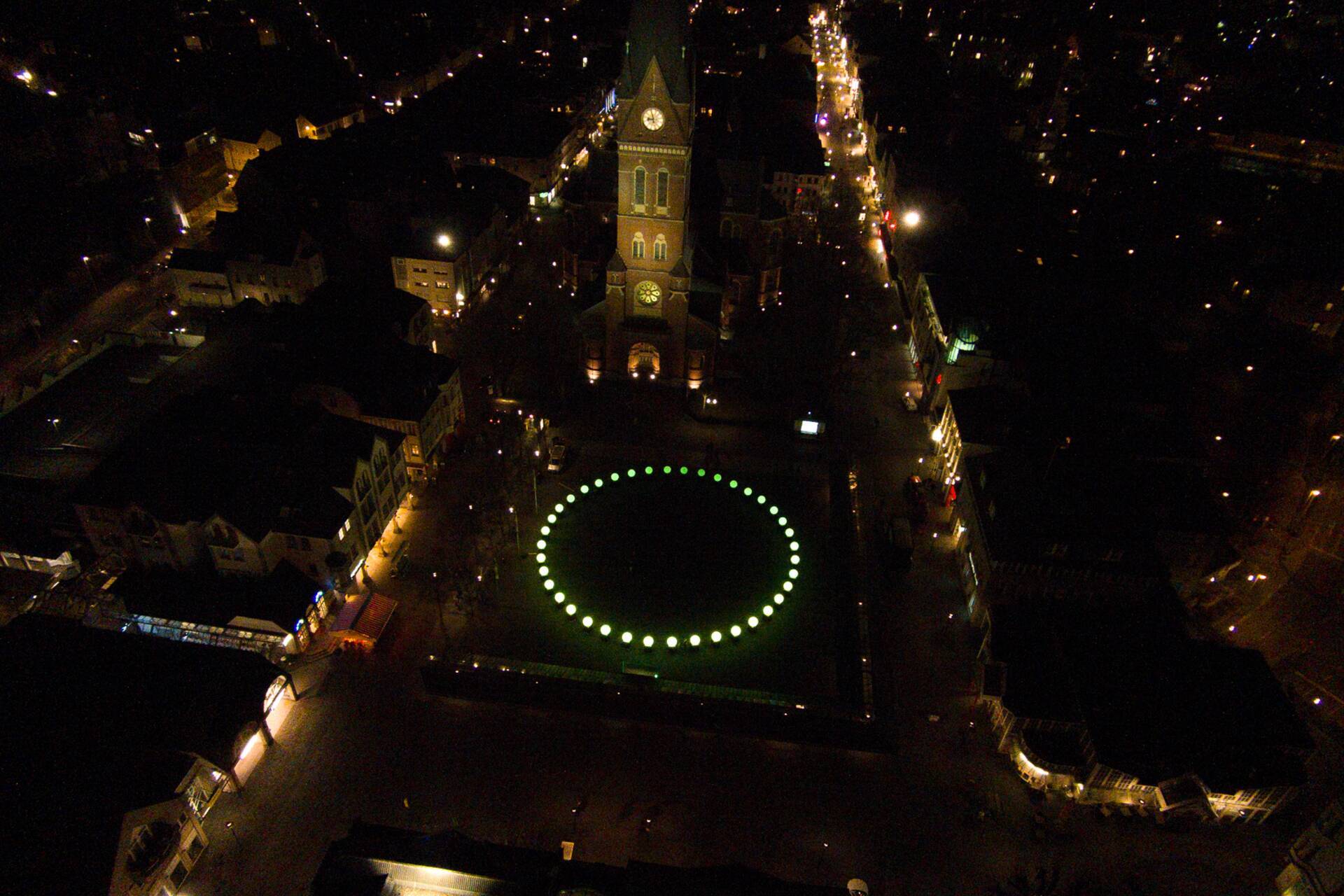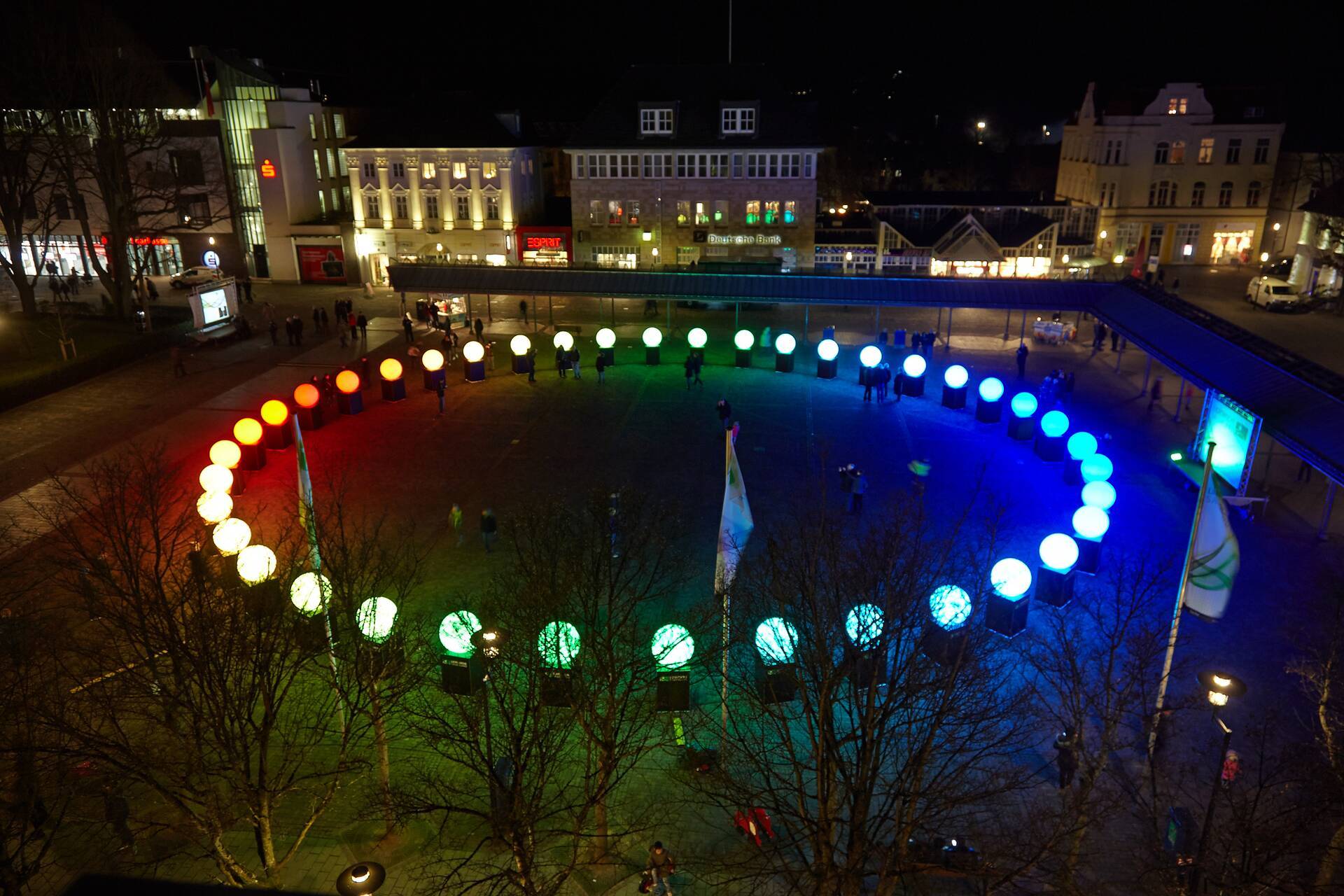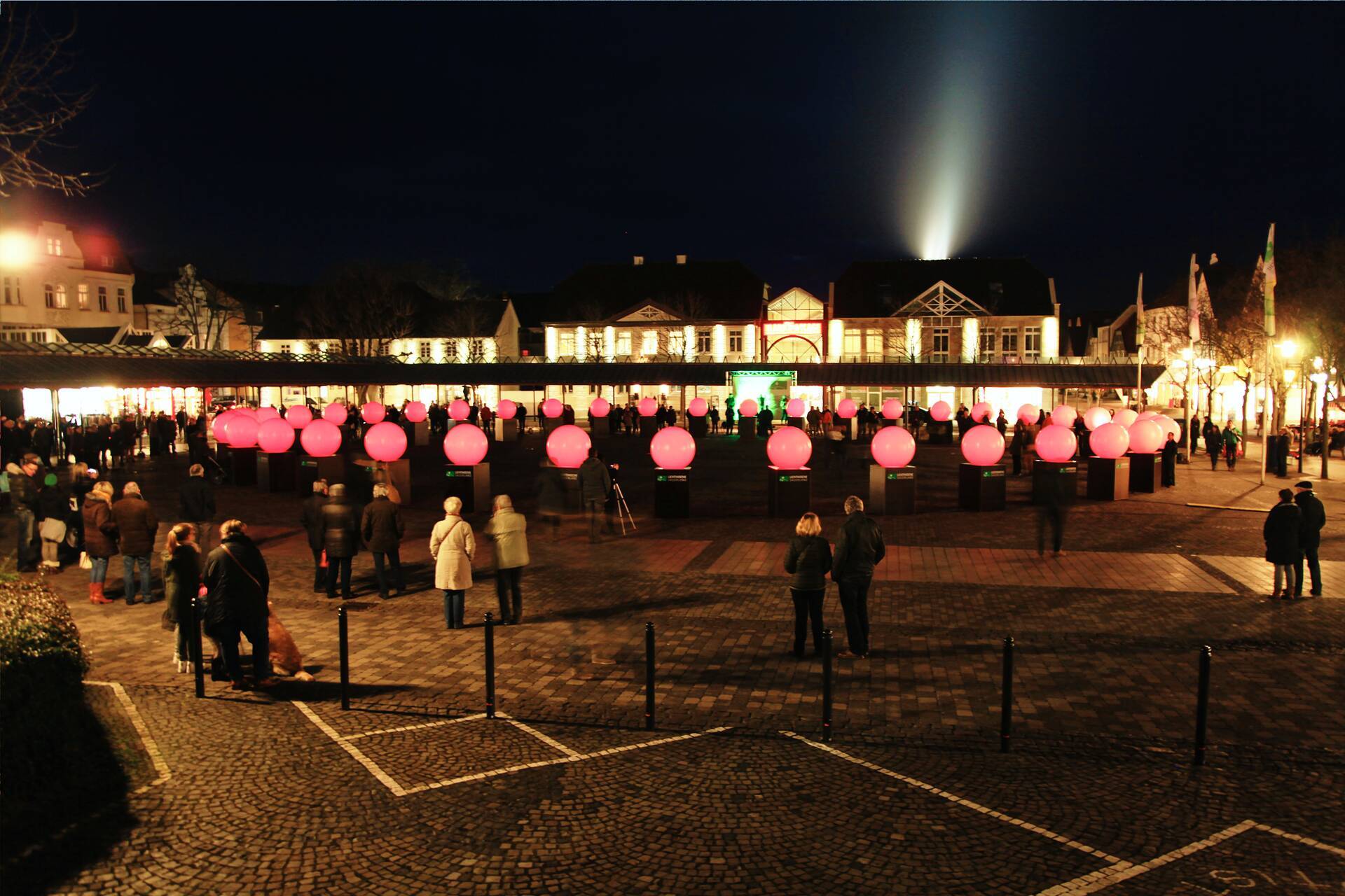 Temporäre Lichtinstallation aus 30 Kugeln auf dem Marktplatz. Dynamisch gesteuerte Lichtmuster strukturieren den Raum und erzeugen wechselnde Atmosphären.